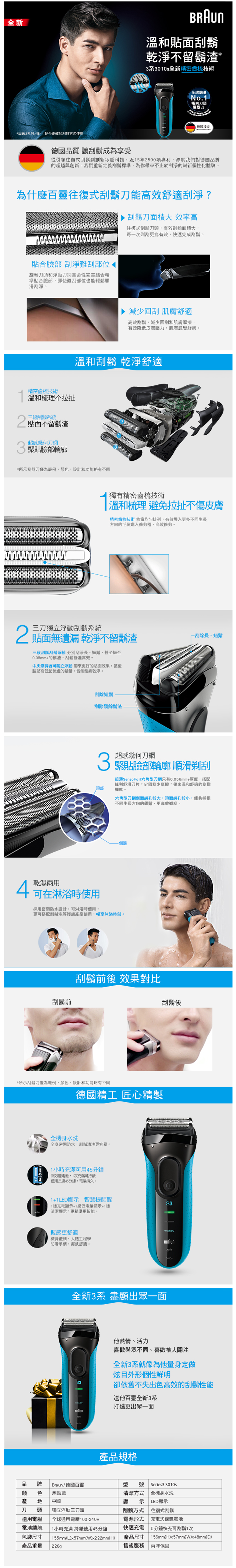 三刀頭刮鬍系統,刮淨不同長度鬍鬚
