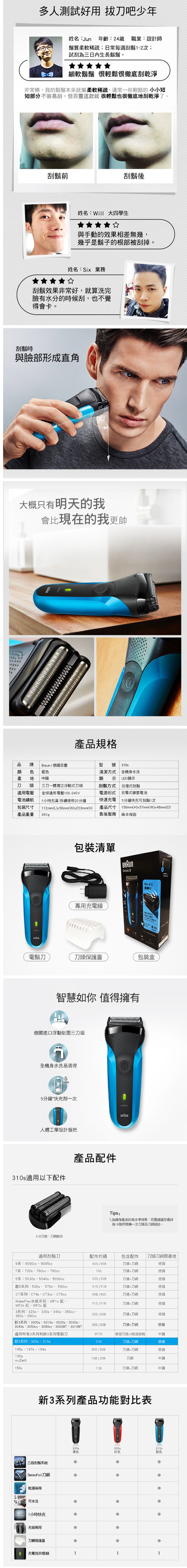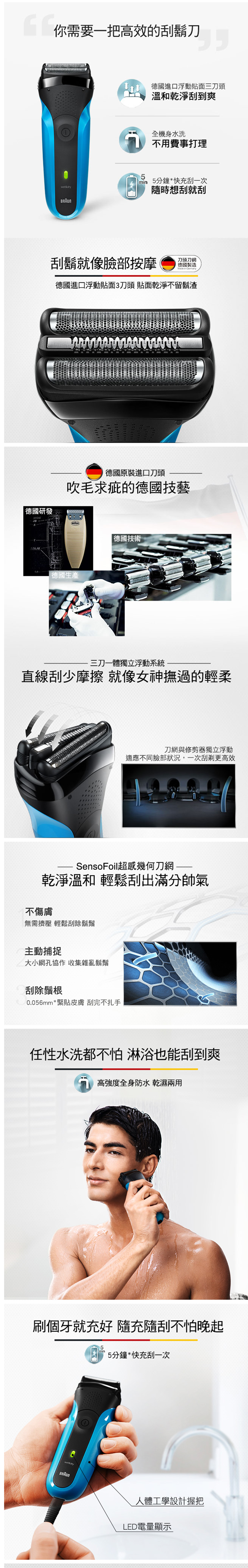 三刀頭刮鬍系統,可以同時刮淨不同長度的鬍鬚