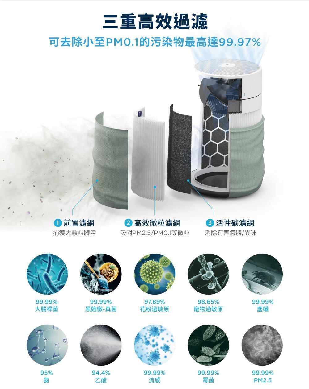 高效微粒濾網,有效去除小至PM0.1懸浮微粒