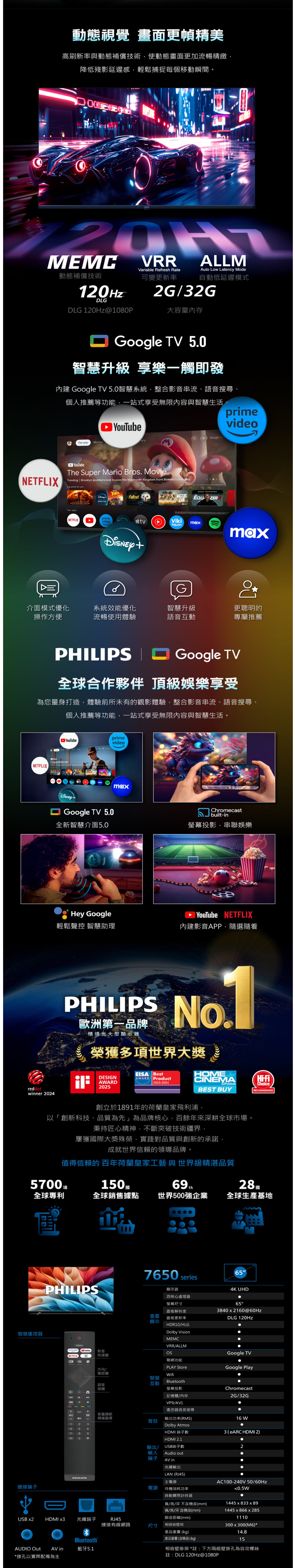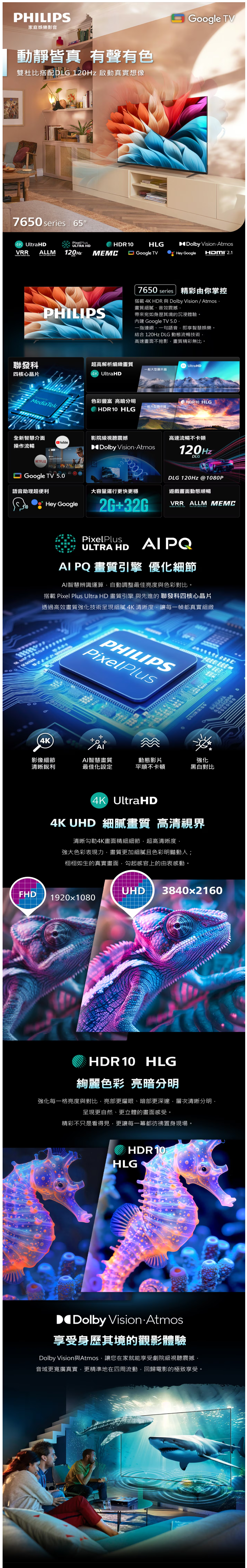 PHILIPS 飛利浦 65吋 4K Google TV 智慧顯示器(65PUH7650)