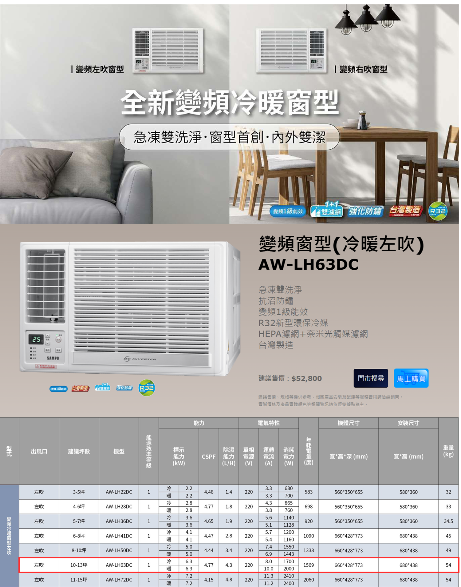 SAMPO 聲寶 9坪 變頻(冷暖左吹)窗型冷氣(AW-LH63DC)
