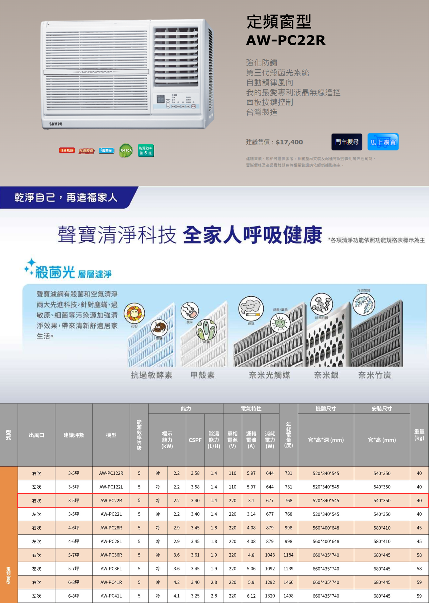 SAMPO 聲寶 3坪 定頻(冷專右吹)窗型冷氣(AW-PC22R)