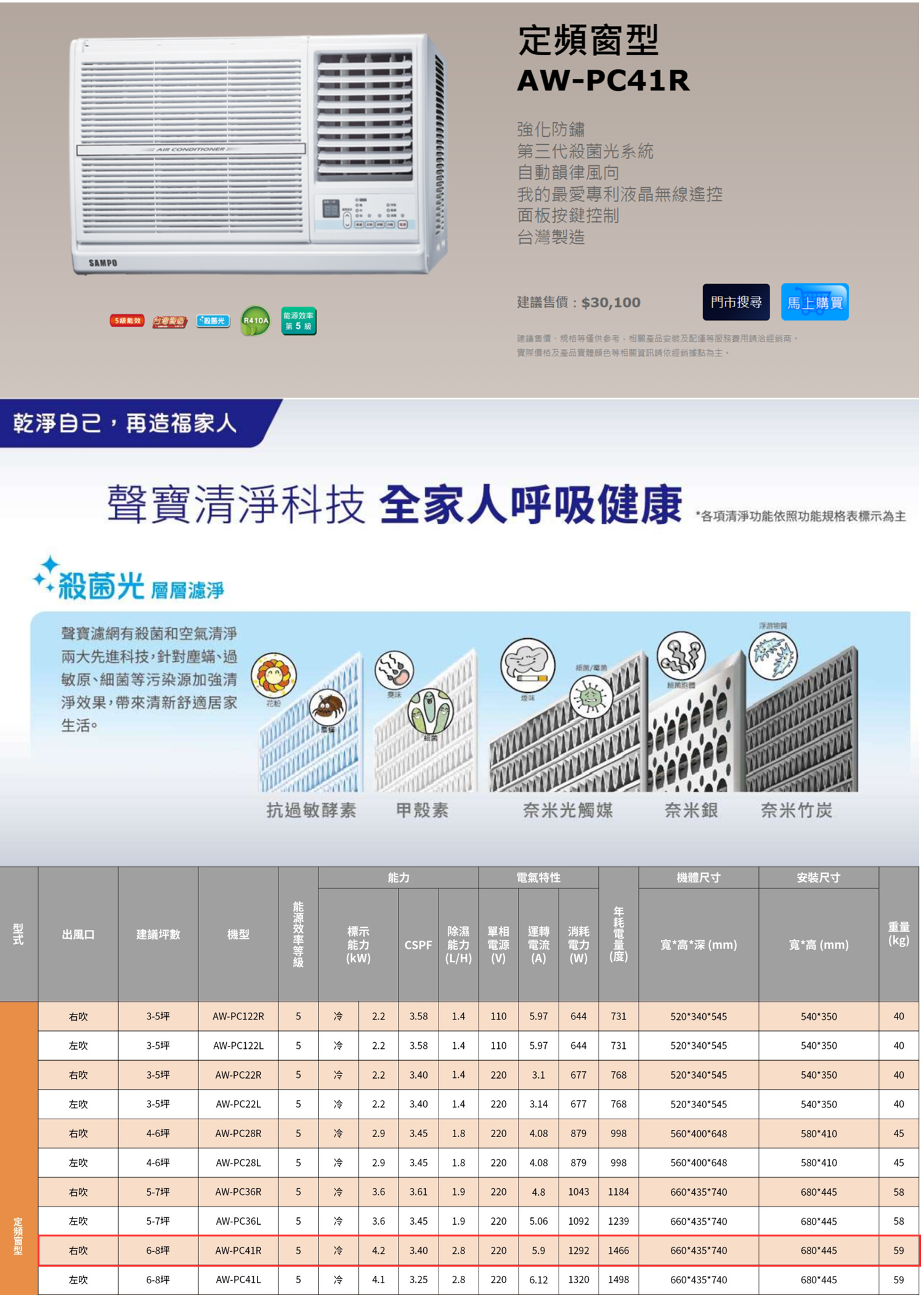 SAMPO 聲寶 6坪 定頻(冷專右吹)窗型冷氣(AW-PC41R)