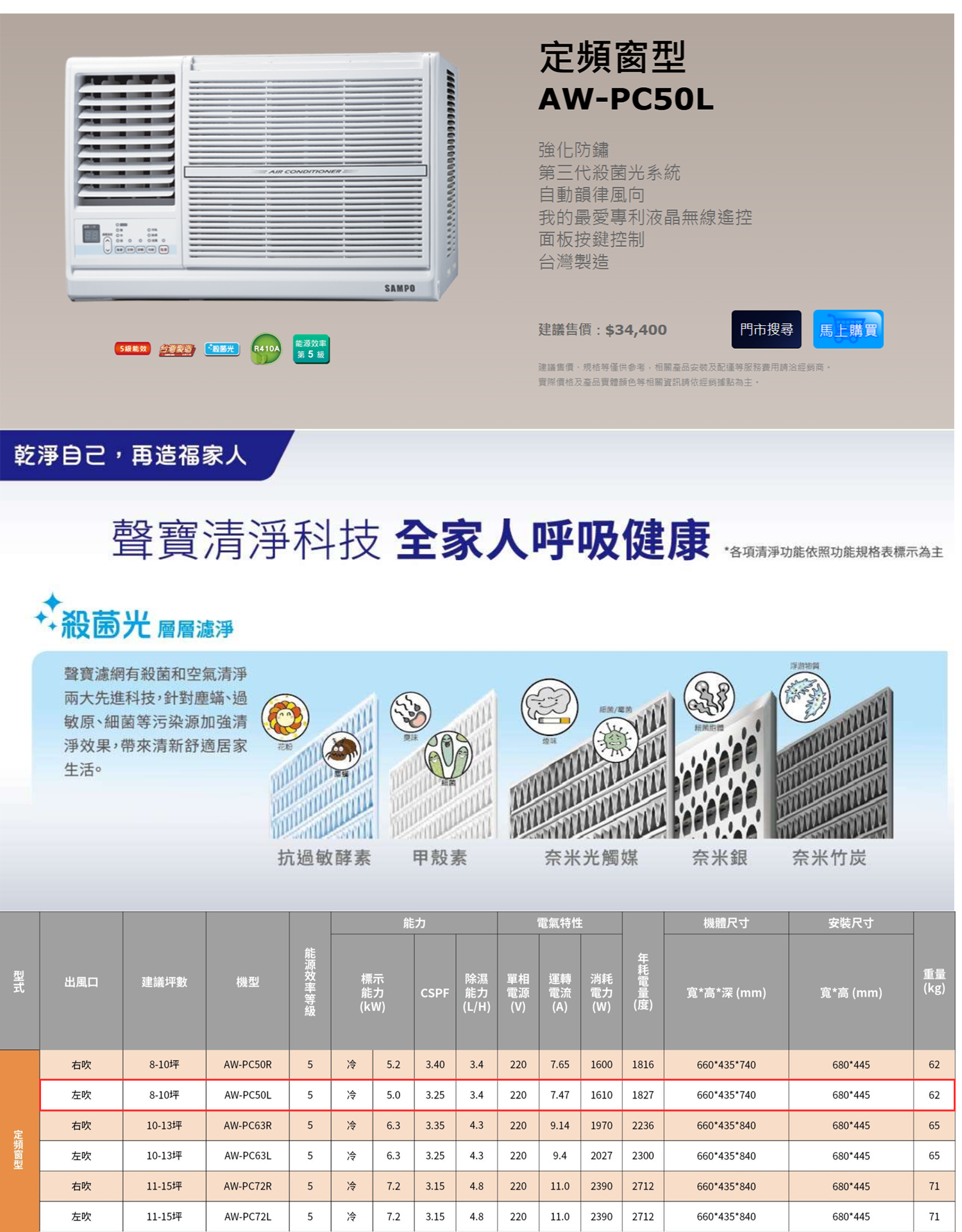SAMPO 聲寶 8坪 定頻(冷專左吹)窗型冷氣(AW-PC50L)