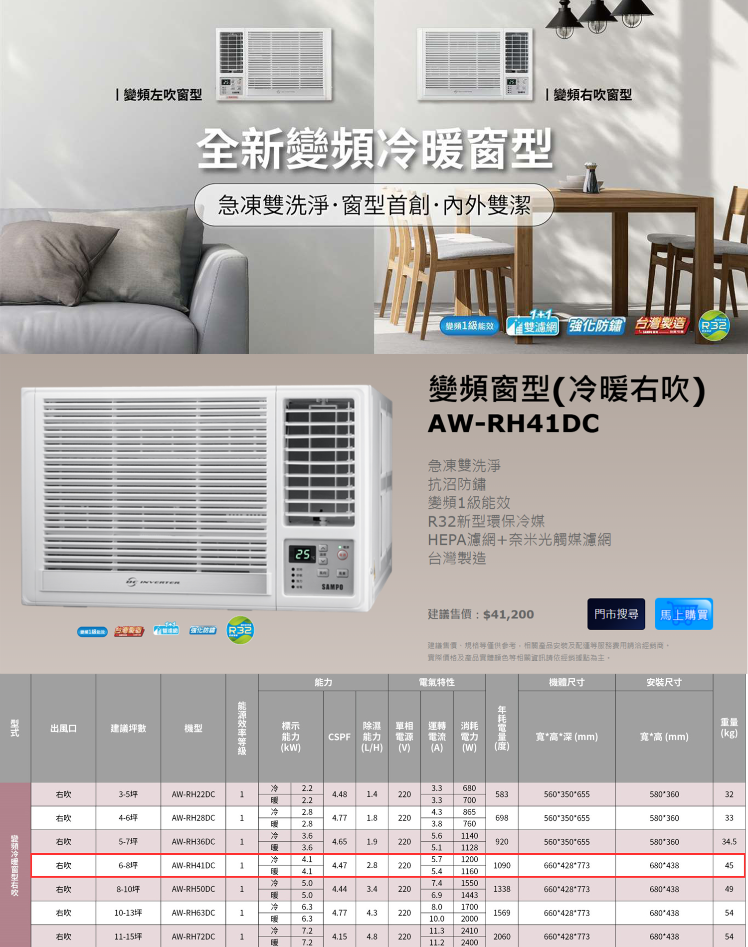 SAMPO 聲寶 6坪 變頻(冷暖右吹)窗型冷氣(AW-RH41DC)