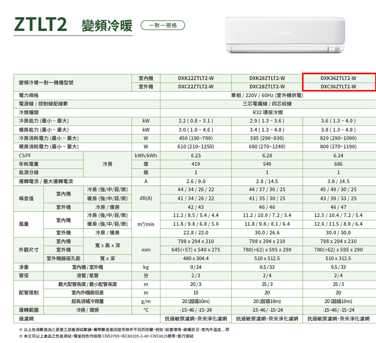 (可議價)MITSUBISHI 三菱重工 4-6坪 朝日ZTLT2(冷暖)變頻一對一空調(DXC36ZTLT2-W+DXK36ZTLT2-W)