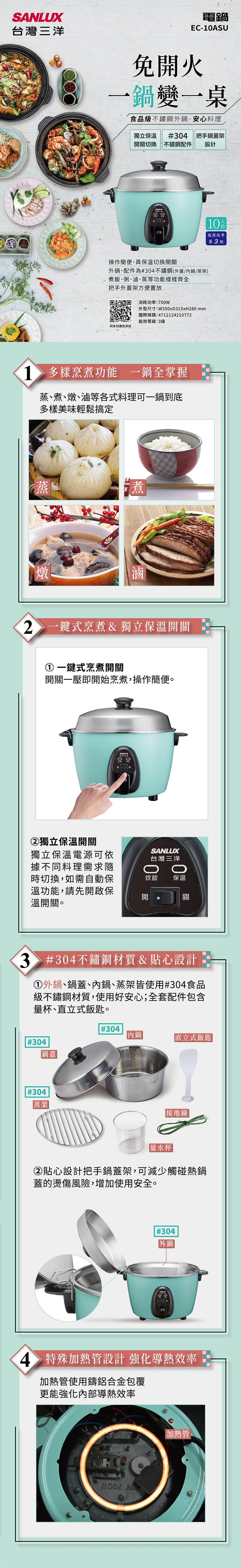 配件為#304不鏽鋼(外鍋/外蓋/內鍋/蒸架)