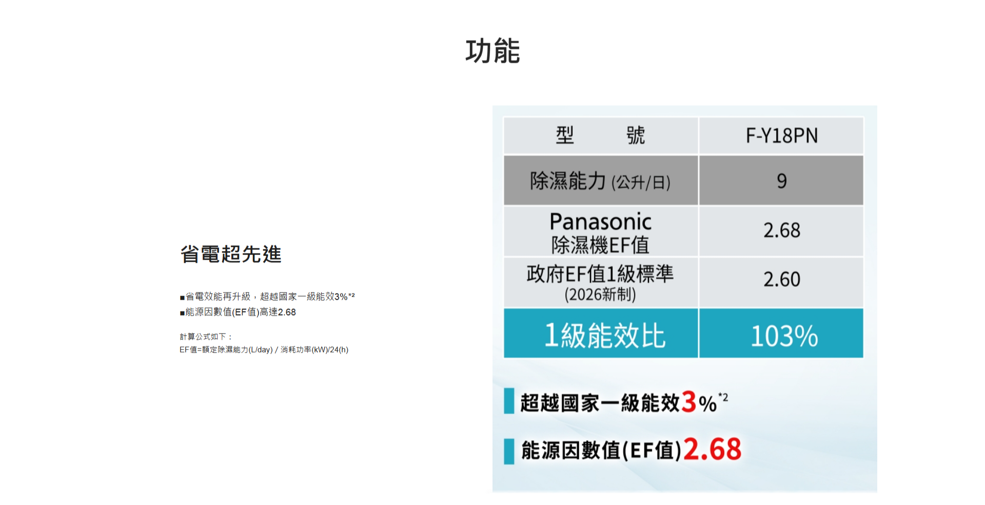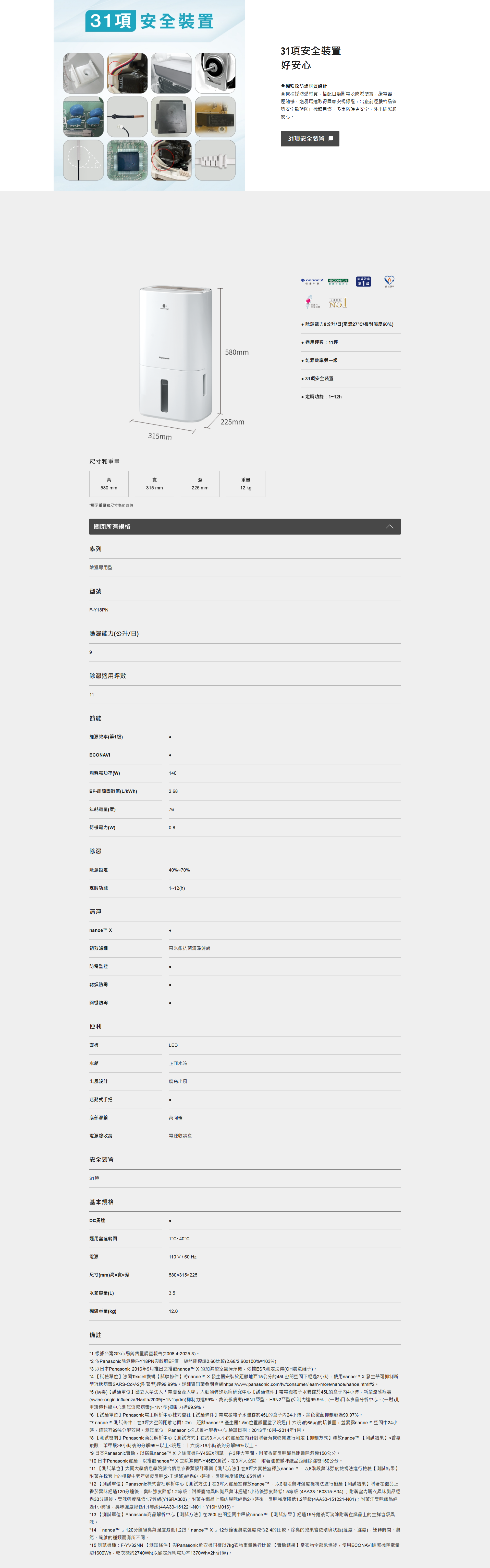 除濕能力 9公升/日(室溫27°C/相對濕度60%)