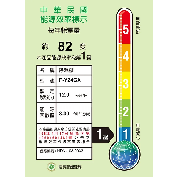 除濕能力 12公升/日(室溫27°C/相對濕度60%)