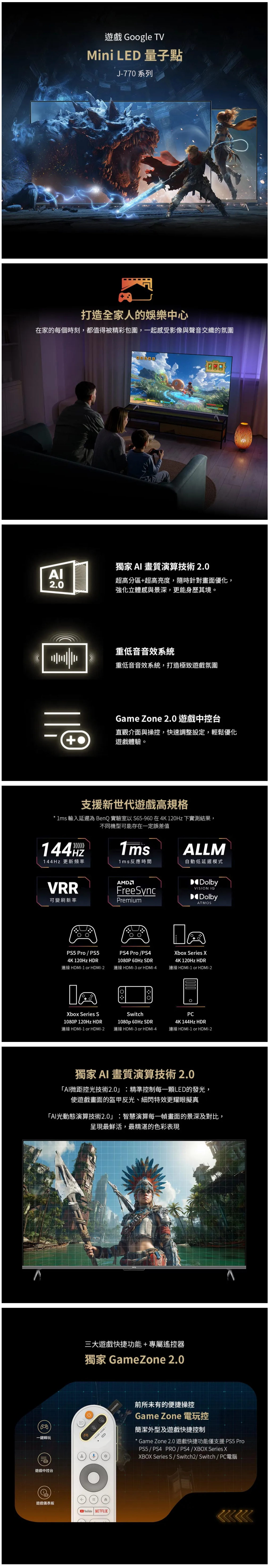 BenQ 明碁 55吋 Mini LED 量子點遊戲 Google TV大型液晶顯示器(J55-770)