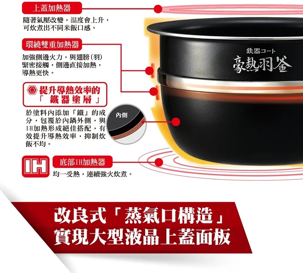 「環繞雙重加熱器+內鍋翅膀形狀」側邊直接加熱, 抑制炊煮不均