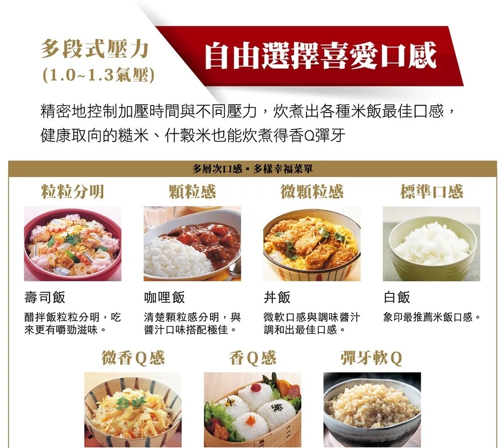 「多段式壓力(1.0-1.3氣壓)」炊煮出不同口感