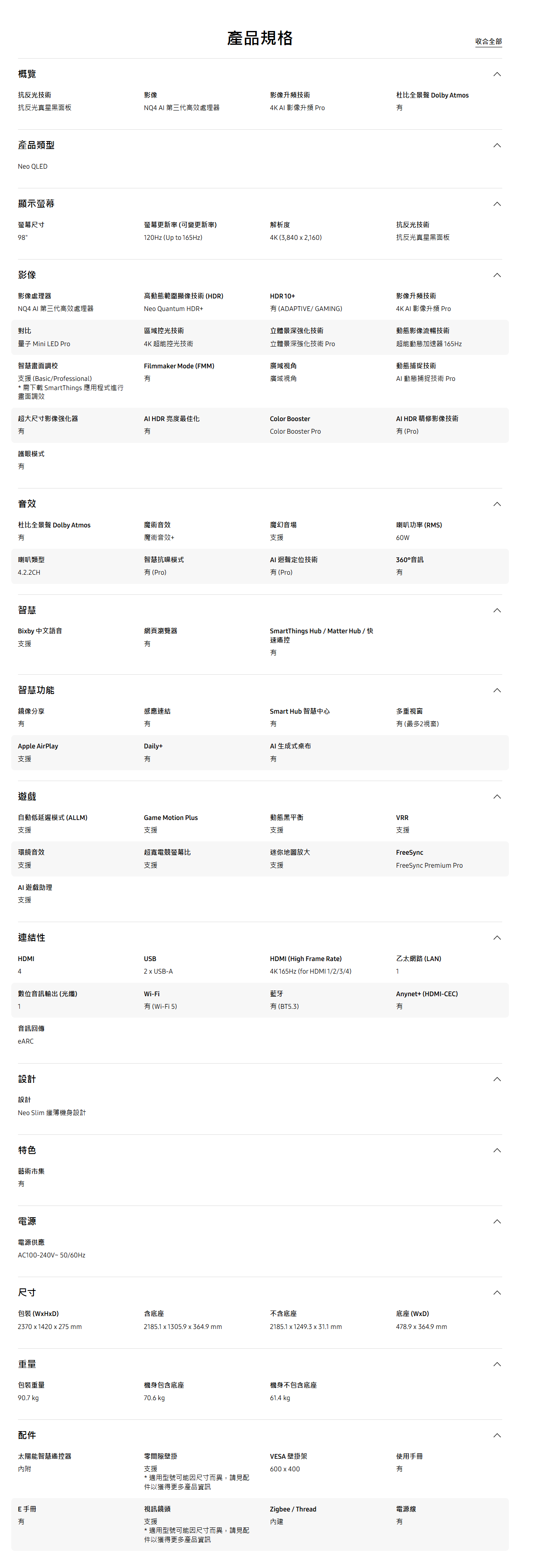 (可議價)Samsung 三星 98吋 Neo QLED QN90F 4K智慧顯示器 2025(QA98QN90FAXXZW)