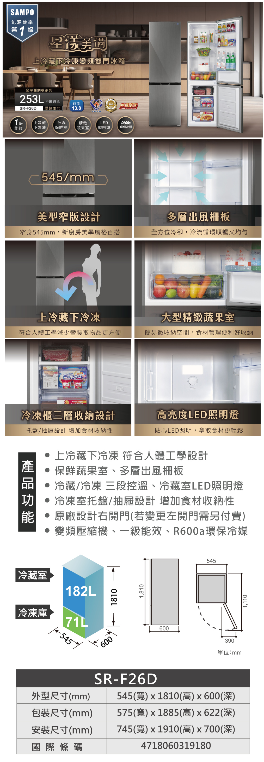 冷藏、冷凍 三段控溫、冷藏室LED照明燈