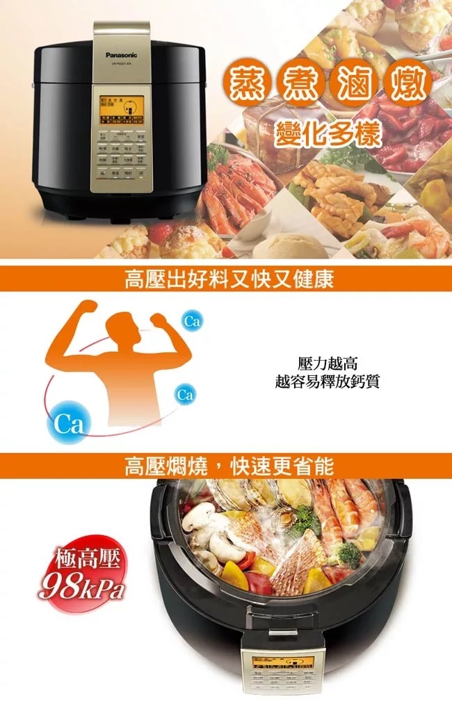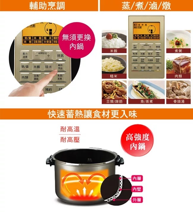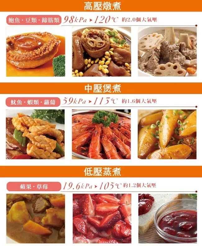 高壓燉煮/中壓煲煮/低壓蒸煮,多元料理對應烹調
