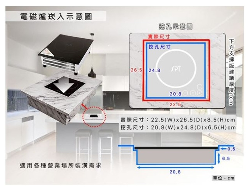 挖孔尺寸:20.8(W)x24.8(D)x6.5(H)cm