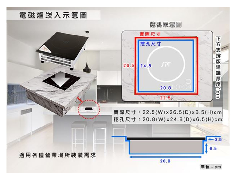 挖孔尺寸:20.8(W)x24.8(D)x6.5(H)cm
