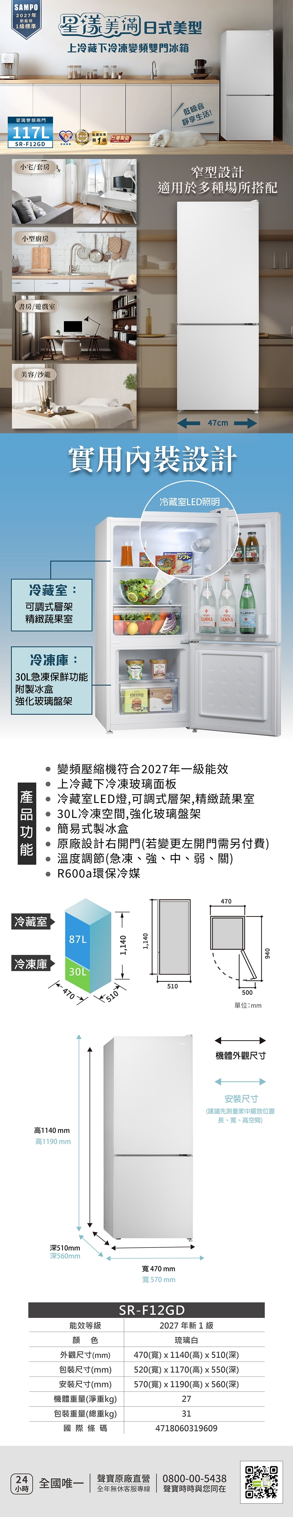冷藏室:LED燈,可調式強化玻璃層架,精緻蔬果室