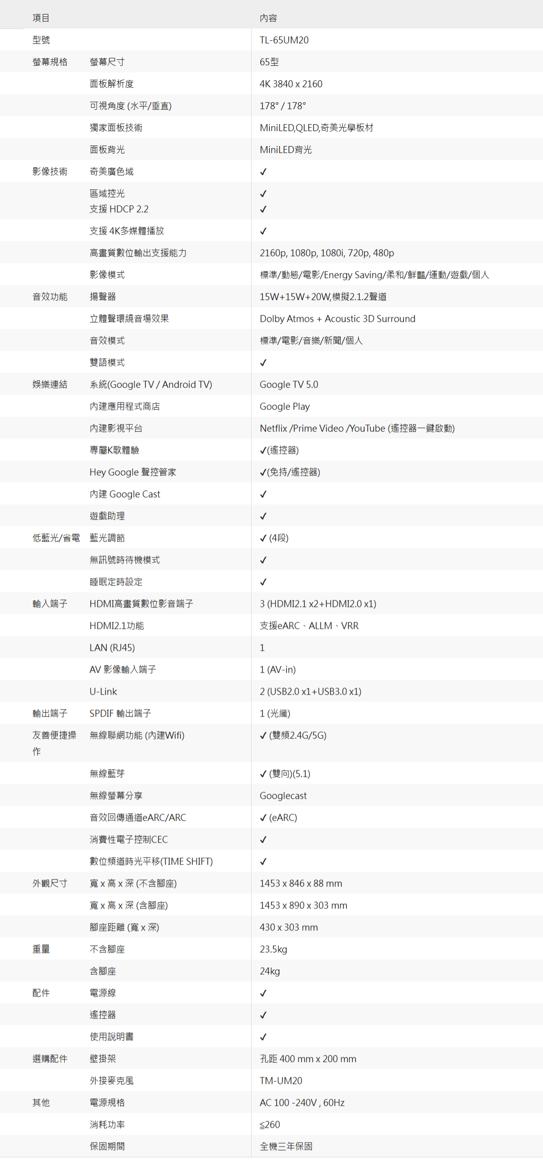 (可議價)CHIMEI 奇美 65吋 AI 4K MiniLED Google TV液晶顯示器(TL-65UM20)
