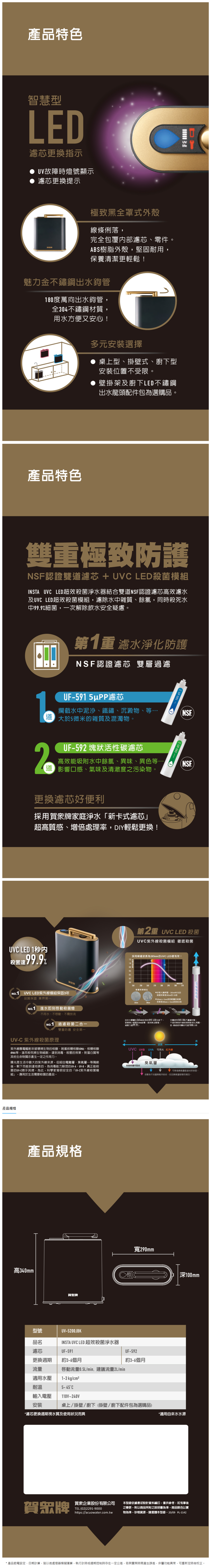採用NSF認證雙道濾芯+UVC LED殺菌模組。