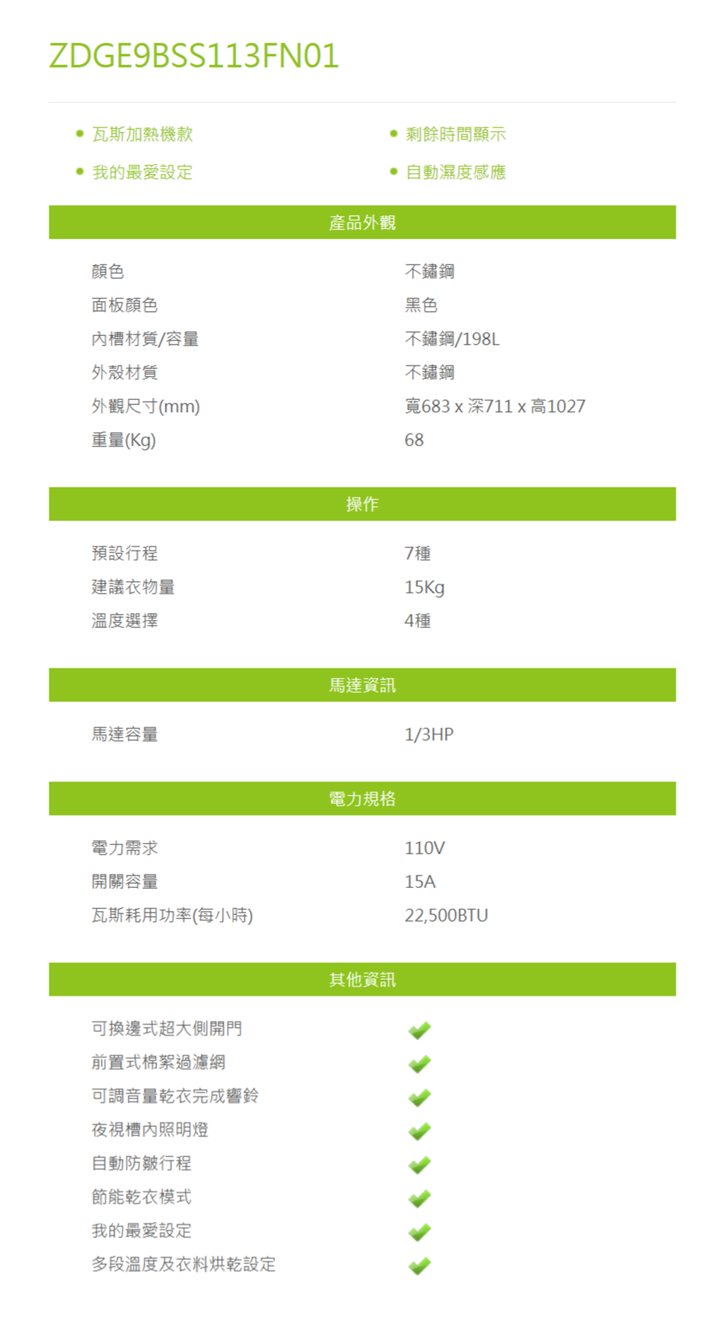 (可議價)Huebsch 優必洗 15公斤 瓦斯型乾衣機(ZDGE9BSS113FN01)